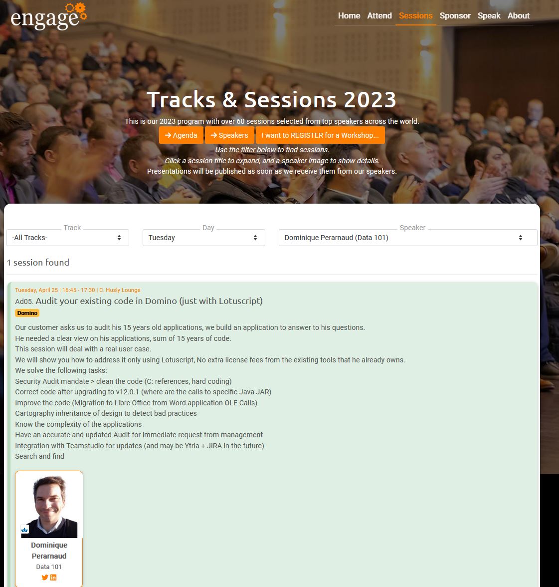 Y por fin, esta Engage 2023 en Amsterdam, la conferencia europea sobre los productos HCL Domino / Notes / Verse / Nomad /Sametime donde presentaré una sesión sobre el audit de código en base de datos desde el punto de vista del administrador Domino.