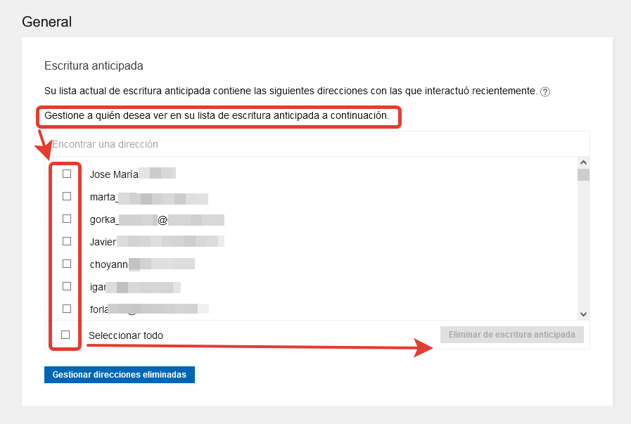 • Quitar direcciones que aparecen en la escritura anticipada de los destinatarios de correo