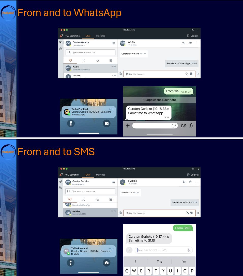 As HCL Sametime is Domino-independent and API-aware, and has already been rebuilt by the group, we watched a demo with a bot on Sametime Chat interacting with AI and WhatsApp.