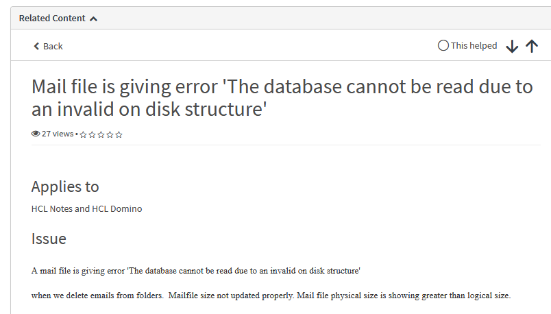 Mail file is giving error 'The database cannot be read due to an invalid on disk structure