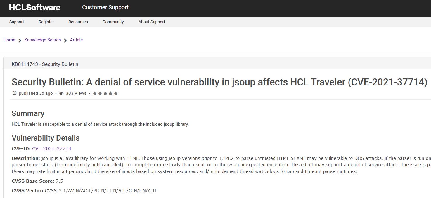 Security Bulletin: A denial of service vulnerability in jsoup affects HCL Traveler (CVE-2021-37714) for the Traveler